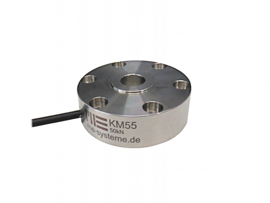 Der Kraftsensor KM55 eignet sich wegen seiner flachen Bauform und seiner Durchgangsbohrung hervorragend zur Messung der Vorspannkraft von Schrauben. Durch Einsetzen von Halbschalen oder Prismen wird eine Anpassung dieser Kraftsensoren für die Messung von Walzenkräften erzielt. Die sechs Durchgangsbohrungen Ø4.3mm erlauben die Befestigung des Sensors oder die Montage eines Prismas. Optional mit M10 Gewinde.